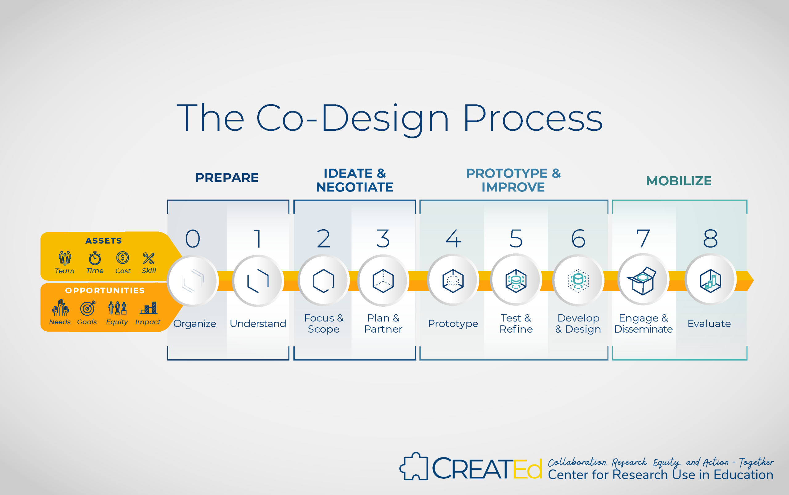 Co-design is an innovative approach to creating more usable research products but also for democratizing research use through more equitable and inclusive processes. The CREATEd co-design process leverages the knowledge and experiences of researchers, educators, communication and design experts, and other stakeholders in envisioning and producing resources that both draw on high quality research and are useful and relevant for achieving greater equity in educational policy and practice.